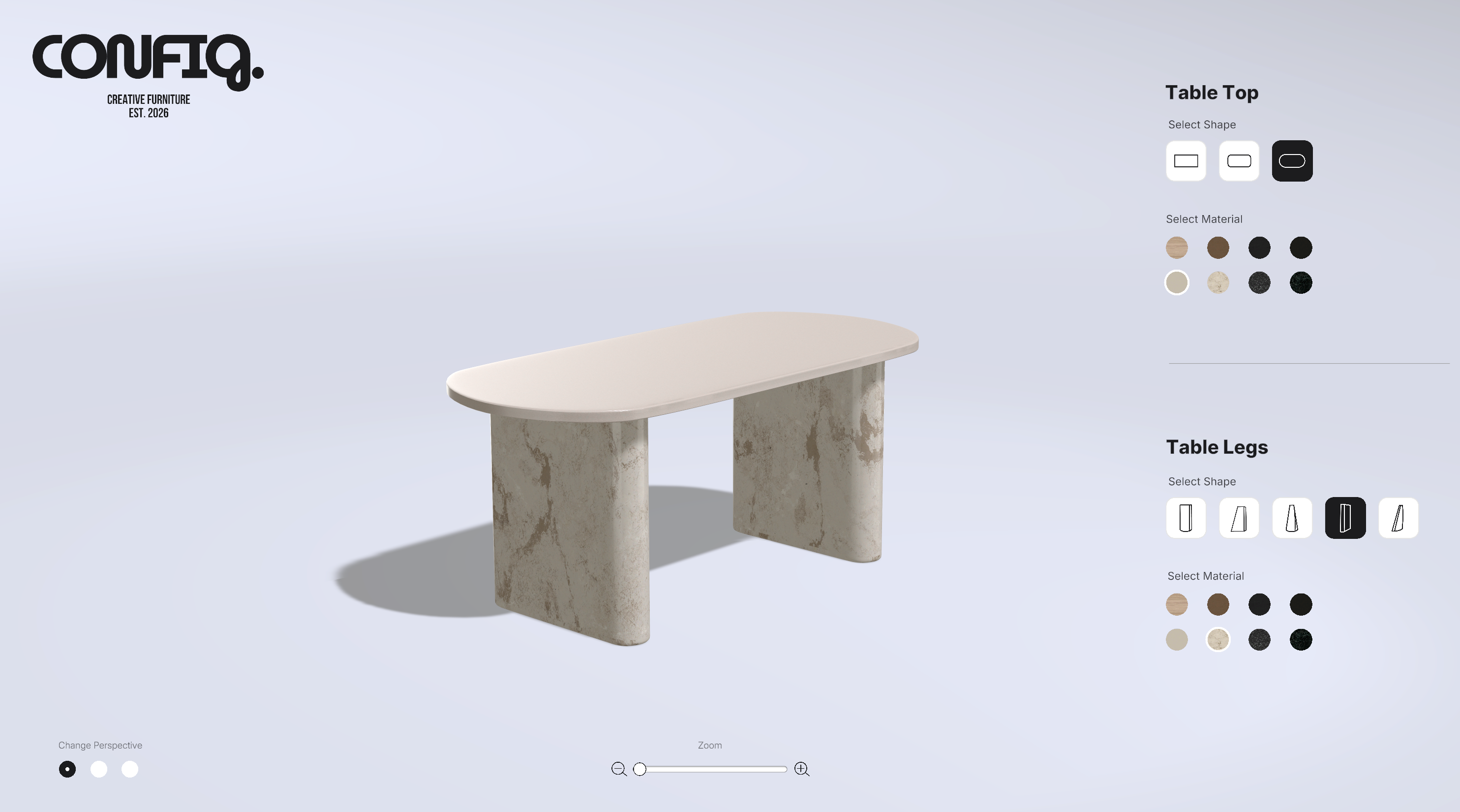 Customize the Tabletop and Legs by switching Shapes and Materials in a clean, minimal UI. The Focus of this Project is Real-Time Rendering, Intuitive Interaction, and a polished Product-Visualization Workflow.